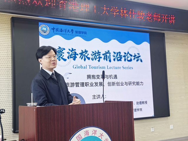 2025年10月23日星期四下午13:30,由中国海洋大学管理学院旅游学系主办的专家讲座《拥抱变革与机遇——旅游管理职业发展、创新创业与研究能力》在管理学院3-1会议室如期举行。本次专家讲座特别邀请香港理工大学酒店与旅游业管理学院助理教授林仕骏老师作为主讲嘉宾,围绕“酒店与旅游管理的前沿研究”“创新创业”“旅游管理职业发展规划”等角度和问题,为同学们带来一场别开生面的讲座,开拓了同学们的视野。讲座由旅游学系主任刘佳教授主持,旅游学系副主任蔡礼彬、旅游管理本科生和硕博研究生共同参与。