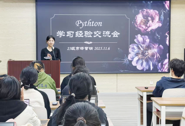 在2025级市场营销班班主任牛璐老师和辅导员景萍萍老师指导下,2025级市场营销班全体同学及其他营销系班级同学参与此次活动,廖睿杰同学与徐艺文同学结合自身经历,从不同角度向同学们传授Python学习经验和技巧。