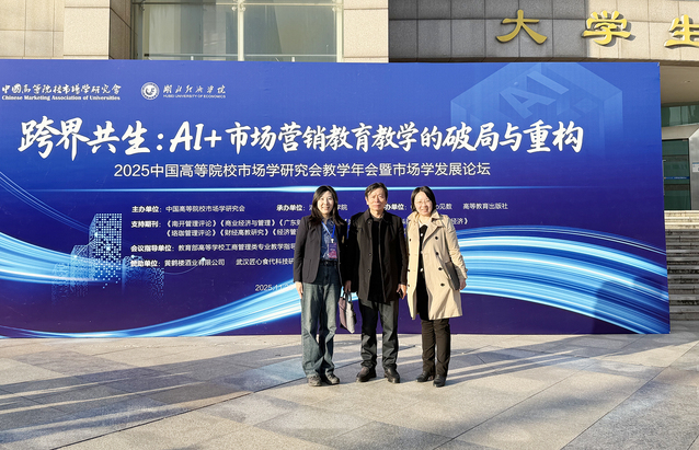 11月28日至30日,由中国高等院校市场学研究会主办、湖北经济学院承办的2025中国高等院校教学年会暨市场学发展论坛在武汉成功举办。本次教学年会以“跨界共生:AI+市场营销教育教学的破局与重构”为主题,共吸引了来自国内近200所高校参会,中国海洋大学管理学院营销与电子商务系主任王举颖、副主任戚昕以及国内交流合作与社会服务部周荣森老师参会。继本年度承办了中国高等院校市场学研究会企业年会并参与学术年会之后,管理学院营销与电子商务系再次融入国内权威性的主流教学盛会。