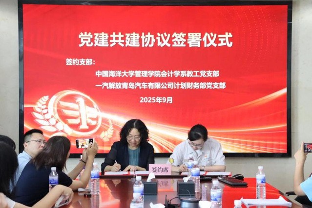 会上,管理学院会计学系主任、会计学系教工党支部书记房巧玲教授与解放青汽公司财务负责人、计划财务部党支部书记崔海艳女士签订《党建共建协议书》。随后,中国海洋大学技术经济研究中心主任李志军教授代表学院向解放青汽公司授予“党组织结对共建”牌匾,双方互赠纪念礼物,表达对校企合作的支持与期待。座谈会气氛融洽,双方一致认为,此次共建是推动产教融合、协同育人的坚实一步,并期待将共识转化为具体合作项目。