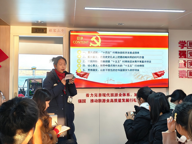 本次海上党课是管理学院持续创新党建工作、拓展思想政治教育载体的生动体现。学院党委积极推进星火燎原宣讲实践,并与青岛旅游集团党总支开展党建结对共建,通过“联学理论、联攻技术、联合育人”的“三联”行动,促进校企协同、产教融合。依托青岛海洋旅游联合运营体2025年游客量已突破400万人次的发展实践,旅游学系与MTA教育中心师生围绕海洋旅游开展深度调研,为本科生SRDP项目、研究生论文写作提供了鲜活素材,推动了学术研究与产业实践紧密结合。