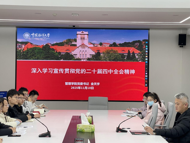 2025年11月17日下午,中国海洋大学管理学院党委书记金天宇在学院306会议室面向定点联系的会计财管硕士研究生第二党支部全体党员和学院各师生党支部党员代表30余人宣讲党的二十届四中全会精神,并召开专题座谈会,围绕国家发展大局、学院“十五五”规划进展以及青年责任三大主题展开深入交流。