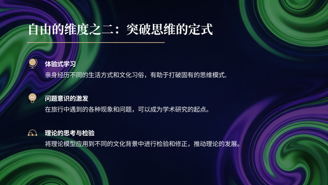 宁靓老师通过举例说明,现代不少学者借助旅行开展研究。例如,法国人类学家克洛德・列维・斯特劳斯深入巴西亚马逊雨林,写出人类学经典《忧郁的热带》;美国作家彼得・海斯勒以在中国的自驾游经历著成《寻路中国》一书。战略管理学家亨利・明茨伯格、营销学家赫尔曼・西蒙等也通过旅行观察获得研究灵感,提出重要的管理学理论。适当的旅行放松能让研究者走出书斋,通过实地考察获得第一手资料,还能接触不同文化、打破思维定式,为学术研究提供“自由” 的探索空间,是一种成为推动学术创新的重要力量。