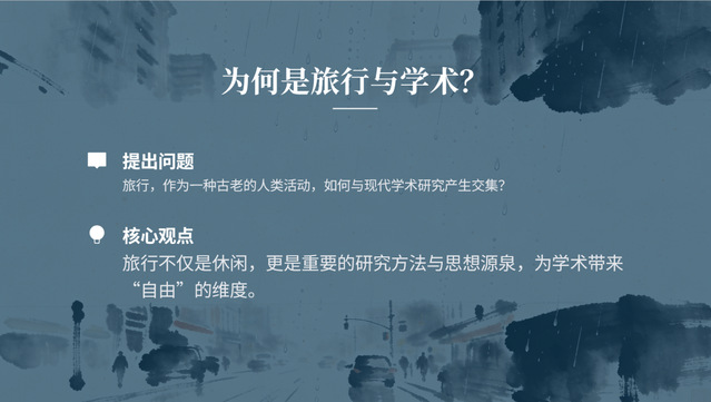 宁靓老师在分享中提到,旅行并非单纯的休闲活动,更是重要的研究方法与思想源泉,为学术探索注入“自由” 维度。从孔子周游列国、司马迁 “行万里路” 的古代游学,到欧洲贵族的环欧求学之旅,再到20世纪60年代后成为独立学科的现代旅游研究,旅行逐渐从休闲活动变成严肃的求知方式。