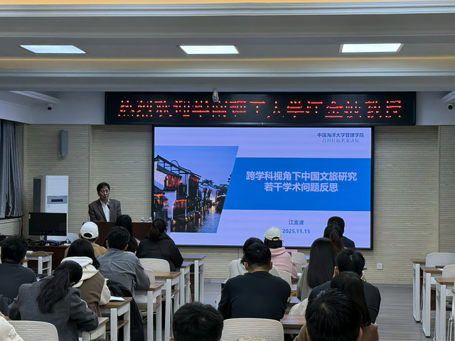11月15日,由中国海洋大学管理学院旅游学系主办的专家讲座《跨学科视角下中国文旅研究若干学术问题反思》如期举行。本次专家讲座特别邀请华南理工大学江金波教授作为主讲嘉宾,围绕“中国文旅研究”“跨学科的学术思考”等问题,为同学们带来一场具有高度、深度和独到见解的讲座,深化了同学们对旅游学科使命担当的认识,开拓了同学们旅游学研究的视野。讲座由旅游学系主任、MTA中心副主任刘佳教授主持,旅游学系张生瑞副教授、王红玉副教授及旅游管理专业本科生和硕博研究生共同参与。