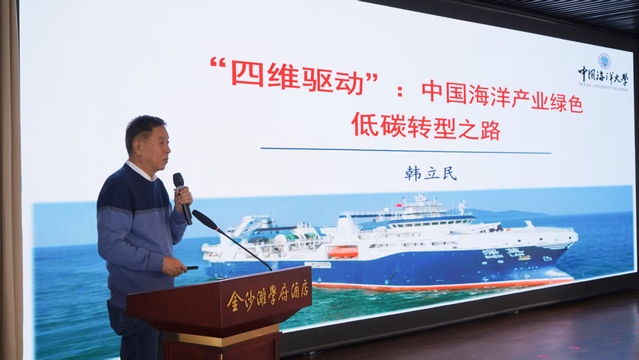 主旨报告环节紧扣“绿色低碳赋能海洋经济高质量发展”。学界与企业界专家就海洋新质生产力布局、产业创新与低碳转型等议题展开深度研讨。中国海洋经济学会副主任委员、秘书长、中国海洋大学管理学院韩立民教授作《“四维驱动”:中国海洋产业绿色低碳转型之路》报告,提出以技术创新、制度保障、主体协同、生态支撑为核心的转型框架,系统阐释了我国海洋产业绿色发展路线图。