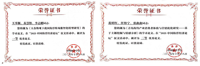 分论坛上,营销与电子商务系教师结合学院在数字经济、产业政策与海洋管理领域的研究积淀,积极分享最新成果与实践案例,充分展示了“数智赋能海洋经济”方向的科研实力与创新探索。论坛评出优秀论文并由中国海洋学会颁发证书:王举颖副教授的学术论文《大食物观下我国海洋牧场数智化转型研究》获一等奖,花昭红副教授的学术论文《青岛海钓产业消费者体验与营销优化研究——基于主题挖掘与情感分析》获二等奖。