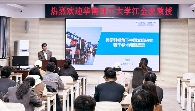 11月15日,由中国海洋大学管理学院旅游学系主办的专家讲座《跨学科视角下中国文旅研究若干学术问题反思》如期举行。本次专家讲座特别邀请华南理工大学江金波教授作为主讲嘉宾,围绕“中国文旅研究”“跨学科的学术思考”等问题,为同学们带来一场具有高度、深度和独到见解的讲座,深化了同学们对旅游学科使命担当的认识,开拓了同学们旅游学研究的视野。讲座由旅游学系主任、MTA中心副主任刘佳教授主持,旅游学系张生瑞副教授、王红玉副教授及旅游管理专业本科生和硕博研究生共同参与。