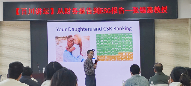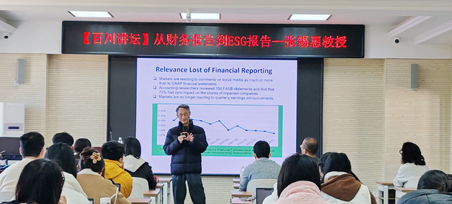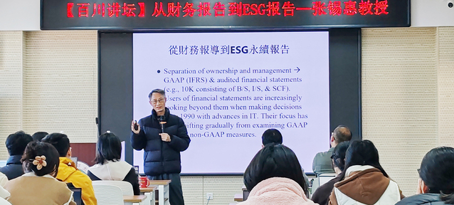 2025年11月21日上午,由中国海洋大学研究生百川讲坛讲座《从财务报告到ESG报告》在管理学院举行。本次讲座特邀Drexel大学KPMG讲座教授张锡惠担任主讲嘉宾,围绕“财务报告的时代局限”“ESG报告的价值融合”等核心议题,为师生呈现了一场兼具学术深度与实践启发的分享,深化了大家对现代企业报告体系转型的认知。讲座由会计学系系主任房巧玲教授主持,管理学院教师和硕、博研究生共同参与。