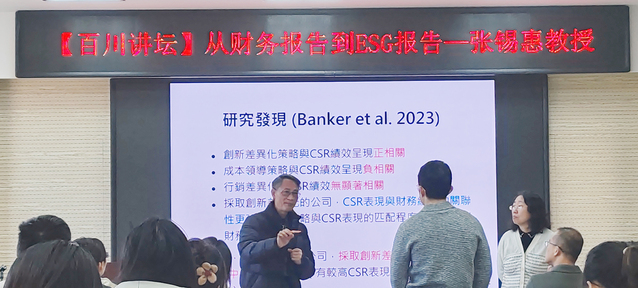 作为会计领域的资深学者,张锡惠教授还分享了国际前沿的研究动态:他提及在《The Accounting Review》等顶级期刊的研究成果,强调ESG报告并非 “财务报告的附加项”,而是商业逻辑迭代下的必然趋势。同时,张教授还介绍了不同的ESG评价标准以及不同国家和地区对ESG评价标准的不同选择,为师生们的学术研究提供了具体参考。