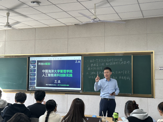 《人工智能商科创新实践》课程由管理学院党委副书记、副院长乔宝刚,工商管理系副主任邓晓辉副教授,工商管理系校友、“科创AI”创始人丛跃,信息科学与工程学部计算机科学与技术学院于彦伟教授,管理学院辅导员苗津铭5位老师联合授课。2025年10月16日,“科创AI”创始人丛跃以生动案例剖析AI在营销、运营、战略等商业关键领域的应用价值,引导学生理解AI赋能业务的底层逻辑,展示AI技术对传统商业模式的深刻影响。在AI数字人实践环节中,丛跃逐步演示数字人形象克隆与声音复刻技术,指导同学们基于真实商业场景,亲手制作自己的数字人视频。这一沉浸式体验,让同学们直观感受到AI在提升效率、创新服务方面的巨大潜力。