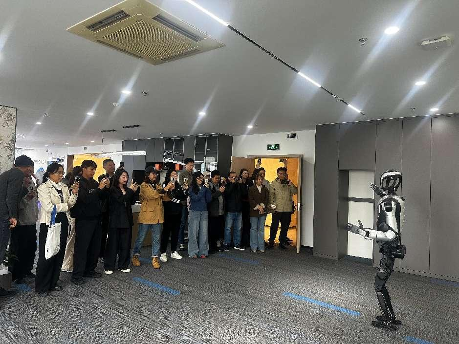 在产品展示区,入选“2024人形机器人10大创新产品”的“夸父”系列,成为本次参观的“明星焦点”。现场,“夸父”直接代替讲解员介绍展厅内容——手臂舒展幅度精准到厘米级,腿部步态稳健流畅,引得学子们纷纷驻足拍摄。