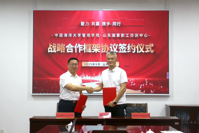 9月24日下午,中国海洋大学管理学院党委书记金天宇、中国海洋大学校友工作办公室主任、教育基金会秘书长孟凡、管理学院国内合作与服务部部长周荣森等一行 6 人,赴青州市中国烟草总公司青州中等专业学校(山东烟草职工培训中心),开展战略合作协议签署暨校友走访活动。签约仪式由中国海洋大学MBA校友、青州中专学校党委成员、副校长陈玉亮主持。